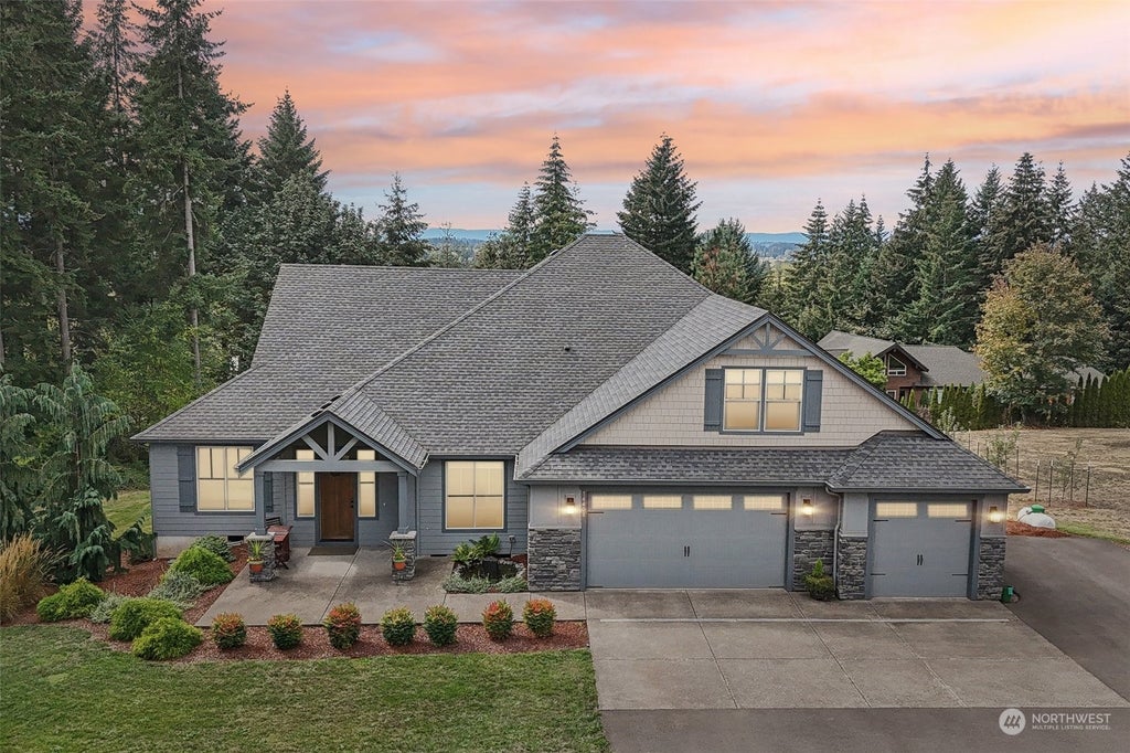 Welcoming water feature & covered front porch. Entry w/wainscoting, tray ceiling. Arched entry to formal dining room. Great rm family rm stone surround gas fireplace. Gourmet island/eat bar SS kitchen, soft-close cabinetry, quartz, pantry. Dining slider to deck. French doors to primary en-suite, WI closet, tray ceiling, deck access, French doors to bath, dual sink quartz vanity, soak tub, shower, priv water closet, skylight. 2 addtl bdrms & baths, den/office, bonus room, laundry/mud room. Exquisite millwork, engineered hardwood, tile, carpet. Covered Trex deck w/steel cable railing, tree-lined property, apple trees, sprinklers. 3-car garage. RV pkg. Land available to build shop! Mortgage savings may be available for buyers of this listing.