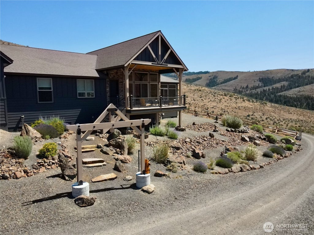 Welcome to an amazing home in Elkhorn Ranch! Just 11 miles East of Ellensburg, this property offers 46+ acres of privacy & adventure w/ direct access to a 900-acre conservancy. Surrounded by Ponderosa pines & sagebrush, you can step outside to enjoy endless recreation & breathtaking views of the Kittitas Valley & Secret Canyon. The 2-bed, 2-bath home includes a luxurious primary suite, two laundry areas, spacious great room, & a large flex/bonus room. Designed for sustainability, it features a 40-panel solar system & 2023 cold-climate heat pump for efficient heating. A 400-amp panel, generator transfer switch, & EV charging ensure reliable power. The property also features a useful workshop and 30'x40' RV garage w/ half bath.