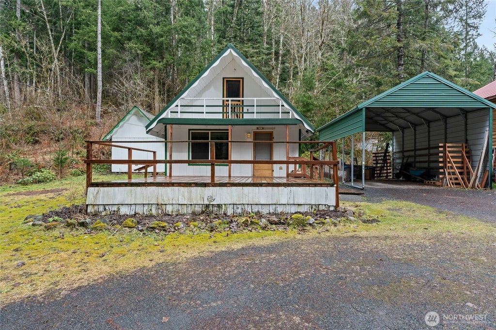 Welcome home to the beloved paradise estates community. This Cabin features 720sqft of living space, 1 bedroom and ½ bath upstairs along with a powder room on the main floor. Upgrades to cabin included new windows, stainless steel appliances, hot water heater, upstairs plumbing, electrical panel, fireplace insert, chimney case replaced with double wall pipe and upgraded stonework all work was completed within the last 3 years. This Home is situated on .40 acres and backs up to private land and Tahoma state forest land. Exterior of the home features a metal roof, large deck and upper balcony to enjoy the surrounding views. Covered carport will stay and outbuilding has a generator hookup and washer and dryer.