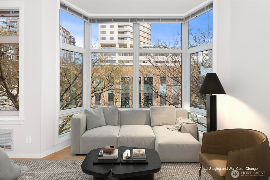 Located in the quiet fringe of Belltown, a quick walk to Queen Anne, the Sculpture Park, Space Needle, Climate Pledge, Myrtle Edwards Park, Burke-Gilman Trail & all that the waterfront has to offer. This very well-managed buildings amenities include a 24/7 concierge, 2 guest suites, outdoor patio, club room with kitchen, exercise room, hot tub, private storage unit in the garage, and caged bicycle parking. Private EV charge share included with the parking space, plus community-shared EV charging in the garage. This studio is open & flooded with natural light. Leave the car at home and skip the traffic jam, stroll to the offices of Amazon, Expedia or Google all while enjoying a cup of your favorite joe. With a walkscore of 96 life is easy!