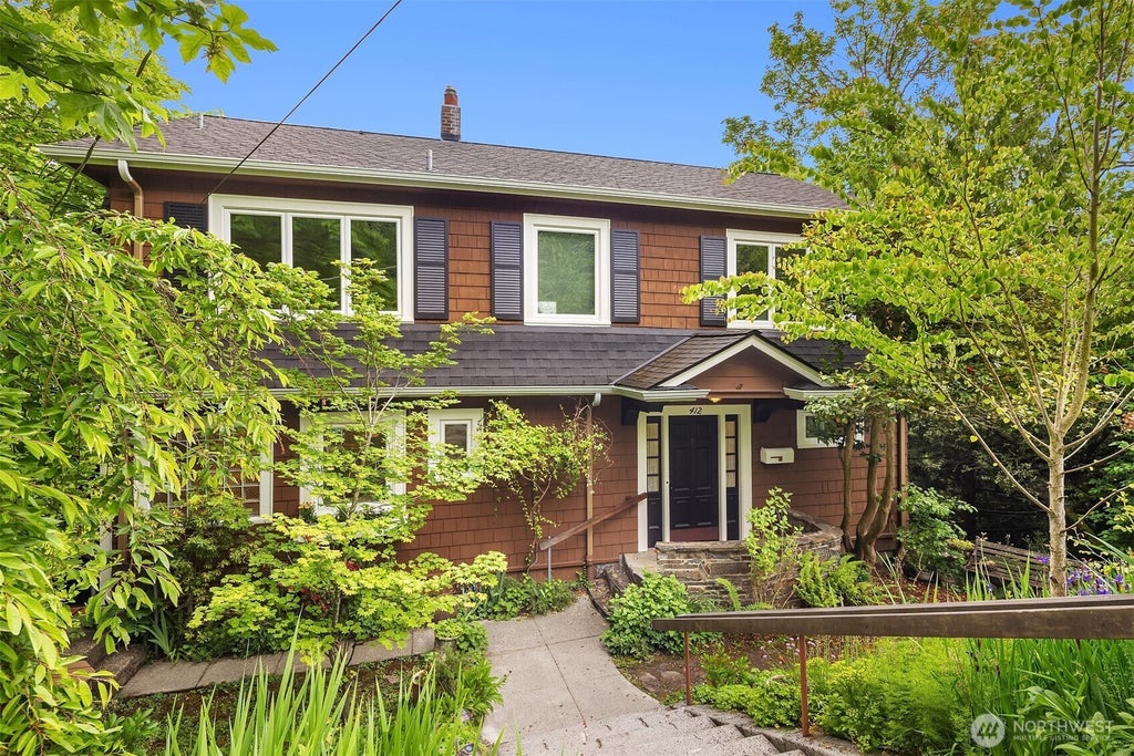 A rare treasure in the heart of Madrona! Tucked along a quiet street, this residence is embraced by secret gardens & serene views, offering a sanctuary that feels a world away. Sunlit living & dining rooms frame sweeping vistas, opening to a fabulous entertaining deck—perfect for al fresco gatherings, while the kitchen extends to an enclosed porch w/ mudroom & shower for added function. Upstairs, four spacious bedrooms include a gracious primary suite overlooking the Lake. The daylight basement provides flexible living space w/ a finished studio/bedroom, while a separate two-car garage adds ease. Nestled among winding garden paths, fragrant blooms & the flutter of hummingbirds, this gem is a rare & enchanting oasis in the heart of the city!