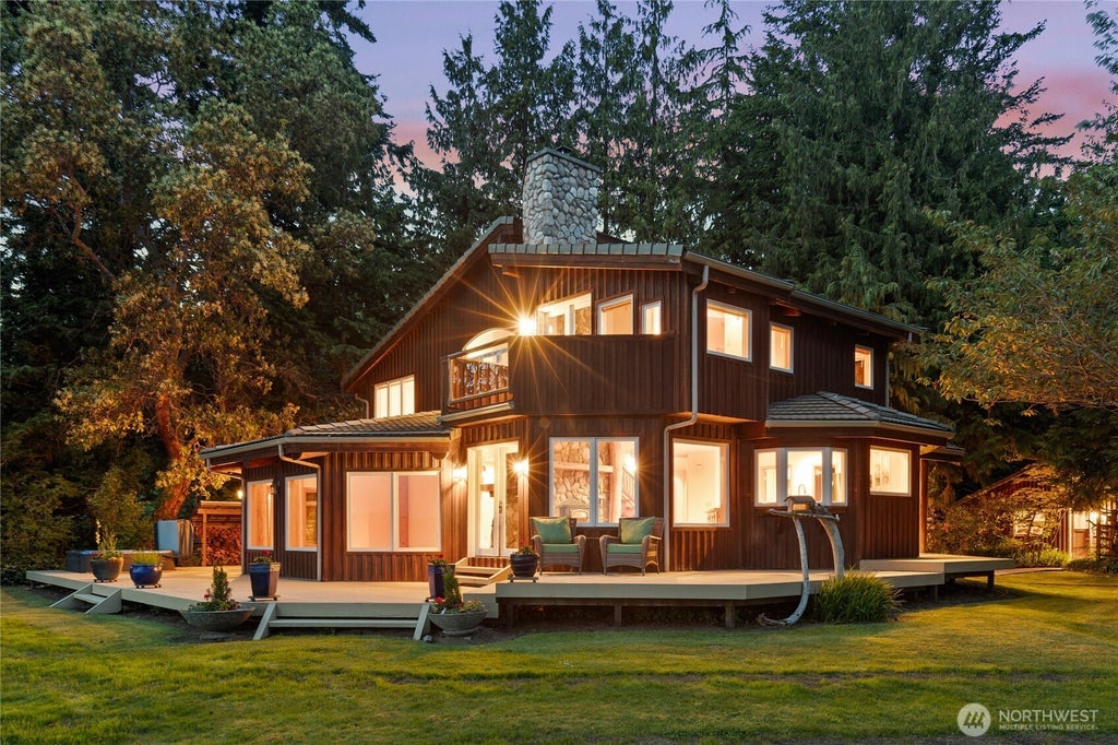 Stunning Camano Island Prime West-Side Waterfront, 2 Homes on 2 Acres. Perched above a private 181' Bulkheaded Sandy Beach w/ Well Maintained Stairs to YOUR Protected Shoreline. Whales, Boat Traffic, Shellfish & Incredible Sunsets. Detached garage/shop PLUS full guest home. Custom-built PNW Architecture, sweeping-views over parked-out timbered grounds. Grand, Lodge-Style vaulted entry beckons guests in to an open layout w/ exposed beams, multiple fireplaces, view deck w/ hot tub. Gourmet kitchen, primary suite, office, large guest bedrooms, & excellent flow to a manicured, timbered shoreline-yard. Separate Cottage has loft-bedroom, kitchen, bathroom...perfect for additional living space. Waterfront Legacy Property...Welcome Home!