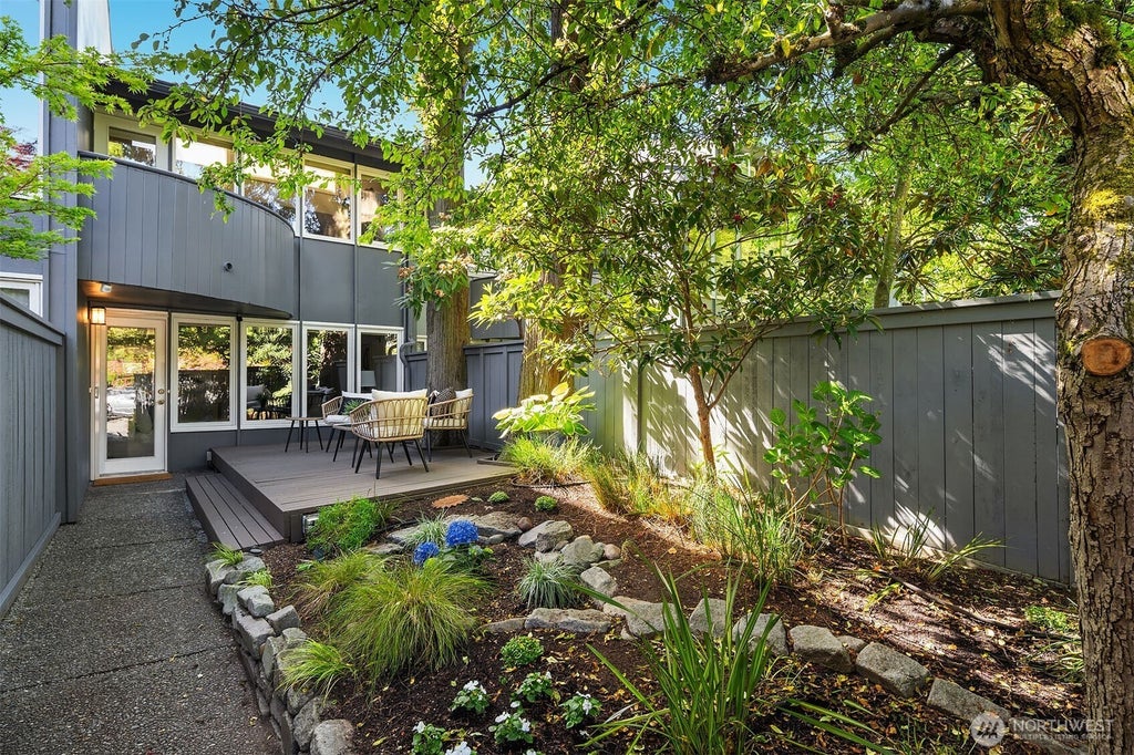 Welcome home to this spacious, quiet Madison Park townhouse, one block from Lake Washington. Enter through private gate to tranquil garden, mature trees, and large deck. Natural light pours through walls of windows. Kitchen with bar seating, dining area and double French doors to sunny back deck. Spacious primary bedroom features great storage with custom California Closet wall system, high ceilings with clerestory windows and treetop balcony overlooking courtyard below. Additional bedroom or office, full bath, and newer Samsung washer and dryer complete 2nd level. Designated parking space in back. Ideal location, just blocks to beach, shops, and dining. The best of Seattle living is waiting for you in Madison Park.