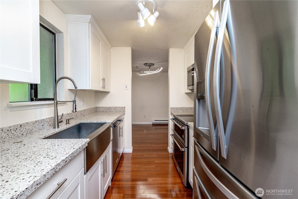 Beautifully renovated 2BD/2BA condo in Sound Vista! Features a fully updated kitchen with new cabinets, quartz countertops, and stainless steel appliances, Brazilian cherry hardwood floors throughout, fully remodeled bathrooms with custom tile showers, new interior paint, and a private deck off the living room. Covered parking and storage. Community amenities: pool, hot tub, sauna, cabana, and walking trails to the Sound. Move-in ready and perfectly located!