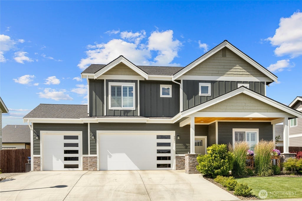 Modern & meticulously maintained 2,702 SqFt home elegantly designed w/ 4 beds+bonus room & 2.75 baths. Inside, enjoy 10-foot ceilings on the majority of the main level, open concept kitchen & living spaces, custom plantation shutters & gas linear fireplace w/custom built-ins. Spacious kitchen white shaker cabinetry + under mount accent lighting, quartz countertops,& stainless steel appliances.The primary suite boasts a vaulted ceiling, large walk-in closet w/ custom organizers, & an en-suite w/ a soaking tub & tiled shower. 3-car garage w/EV charger circuit & wired for generator. Beautiful covered & lit patio, fully fenced private backyard w/ lush landscaping, & underground sprinkler system fed by irrigation water complete the outdoor oasis