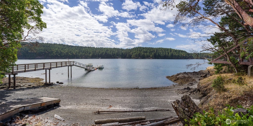 Crane Island Waterfront Gem. Many recent upgrades & updates to this property have added even more to this unique property. Dock your boat at the shared dock adjoining the property, wander up past the cove beach to the south-facing classic mid-century modern retreat. Designed by acclaimed architect Paul Hoag, the main house blends nature outdoors & tranquility within. New appliances throughout, updated lighting and plumbing fixtures, and a freshly tiled primary bath floor with radiant heat add to the ambiance of the old-growth cedar-lined walls and stone fireplace. Guesthouse, designed by acclaimed architect Wendell Lovett, is genuinely one of a kind. The outdoor areas are designed for entertaining & making the most of island life.