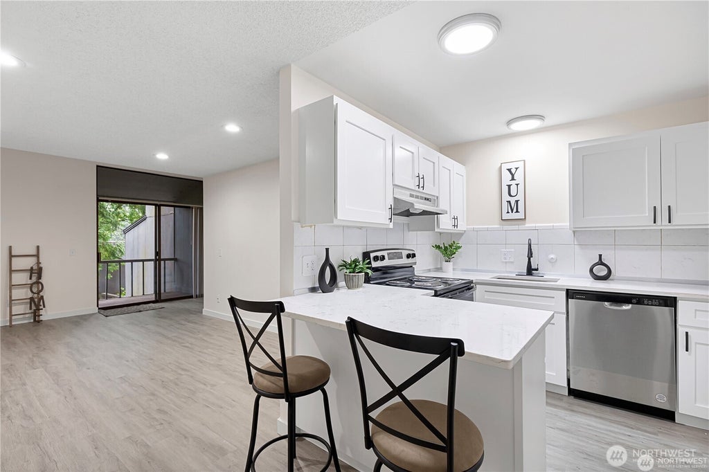Featuring this exquisite town-home with modern design features, located in Eastsides finest resort-style condominium community, Sixty-01! Everything has been completely updated, including new floors, paint, lighting & appliances. In the bedroom you will find a large picture window w/ peak-a-boo lake views, 2-closets, & attached full size bathroom. Downstairs is the light filled kitchen, dining & living room leading to your very own private deck to enjoy your morning coffee & take in nature. The kitchen boasts quartz counter tops, SS appliances & peninsula seating area. Amenities include 4 pools, clubhouse, sauna, rec room, garden space, tennis courts, & more. Easy access to Microsoft and I-405, No rental cap.