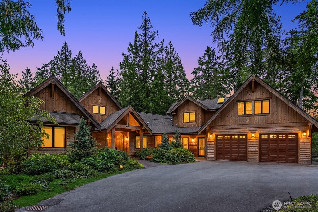Surrounded by lush landscaping that evokes the beauty of an alpine retreat, this stunning PNW lodge style home is a must see. Wide plank flooring, exposed wood beams, and a striking stone fireplace and soaring vaulted ceilings in the great room. The open-concept kitchen features sueded quartzite countertops, a curved live-edge wood bar, rich rustic alder cabinetry, and an impressive 22-foot walk-through pantry. The spacious primary suite opens to a large deck with hot tub and serene treetop views. Thoughtfully designed for aging-in-place, this home offers step-free access, and wide hallways and doorways for comfort and ease. Be sure to explore the raised gardens, orchard, and charming garden house—this property is truly something special.
