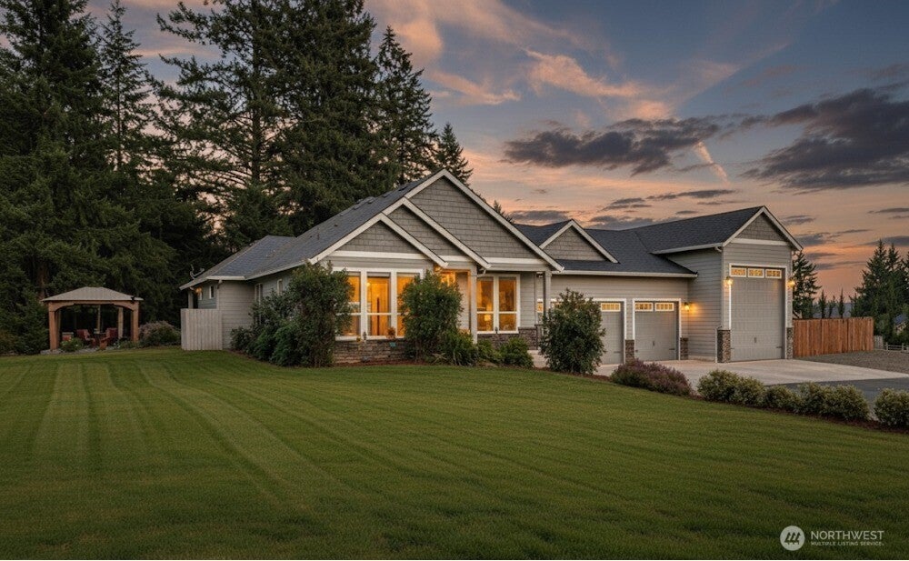 This 2018 custom Cascade West, single-level home sits on just over 2.5 acres, offering seclusion and convenience, only 10 minutes from town, and located in a gated neighborhood. Nearly 2,700 sq ft of living space with high ceilings, an open-concept layout, and a cozy fireplace. The kitchen features a massive island, and a walk-in pantry. Permanent roofline lighting, hot tub, and an oversized covered patio that is perfect for year-round outdoor living. With 4 spacious bedrooms, a huge almost 1,700 sq. ft. garage, and an attached RV bay (46’ deep with a 14’ door), pristine condition throughout, you get all the benefits of a new build without the wait. Come experience PNW living at its finest!