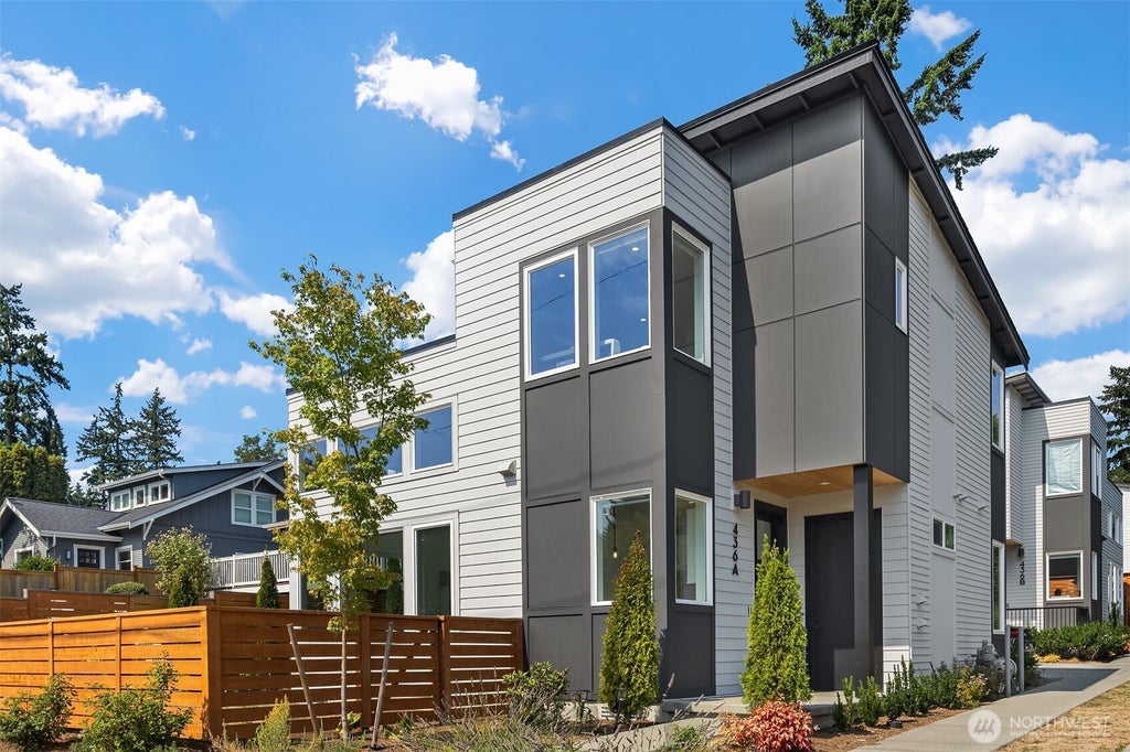 Stunning 3bed/2.5bath modern residence in coveted Norkirk neighborhood. Light filled, open-concept main living features sleek kitchen w/ample cabinetry, quartz countertops, gas range & central island. Great room boasts soaring 2-story ceiling & south-facing floor-to-ceiling windows flooding the space w/natural light. Guest suite on the main. Upstairs, a loft & 2 additional bedrooms w/own en-suite bath. Each living area is equipped w/mini-split for year-around comfort. Step outside to spacious covered patio w/outdoor heater & fully fenced private yard. Oversized 1- car garage w/EV charger & additional driveway parking. Luxury finishes & energy efficient features throughout. Sought-after LWSD. Just a short stroll to DT Kirkland & waterfront.