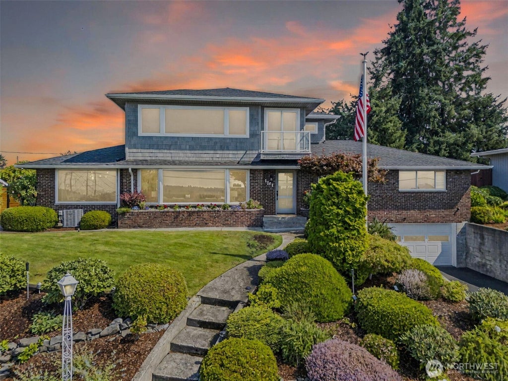 Price Drop!! Panoramic views of the Narrows Bridge, Puget Sound and Olympics await! In the evening, enjoy breathtaking sunsets from this beautifully updated home located on a private, dead-end street. Light-filled living spaces include a chef’s kitchen with quartz counters, spacious island, and skylights. Enjoy a stunning primary suite with spa-like bath, walk-in closet, and sweeping views from your private balcony. The home also boasts a junior suite and 2 additional bdrms on the main floor. A game and movie room, modern finishes, and thoughtful design make this home perfect for both relaxation and entertaining. Don't miss the expansive outdoor oasis featuring a covered patio, gas fire pit, and sparkling pool. Too many amenities to list!