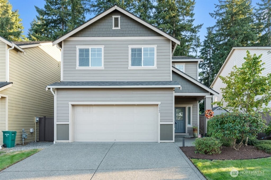 Welcome Home to the desirable Edgeview community of Lakeland Hills. Step into this stunning two-story home where style, functionality, & location come together in perfect harmony. As you walk into the open-concept main floor, you're immediately greeted by expansive views of the fully fenced backyard & the tranquil wooded area beyond, creating a warm, welcoming, & peaceful atmosphere to enjoy from your covered porch. The living room features a cozy gas fireplace & beautiful built- shelves. The kitchen has soft close cabinets, a walk-in pantry, granite counter tops, stainless steel appliances & a gas stove. Enjoy speakers throughout the 3 bed plus den house, A/C, jetted tub, upstairs laundry, E.V. charger & an underground sprinkler system.