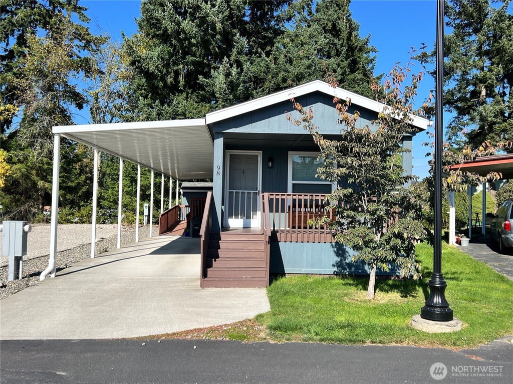Welcome home to Belmor Park, a gated 55+ community in Federal Way, offers resort-style living with a private 9-hole golf course, indoor pool, spa, sauna, fitness center, and clubhouse featuring a game room, library, and ceramics studio. This newer 2019-built, 2-bed, 1.75-bath home is perfectly located with a partial golf course view and greenbelt in back. Guest parking across from home. The home is tastefully finished with white cabinets and millwork, main suite bathroom, a tandem carport, a storage shed, access ramp, and a heat pump. Residents enjoy beautifully maintained grounds, a dog park, craft room, and social activities. Conveniently located near The Commons Mall, dining, medical facilities, and transit.